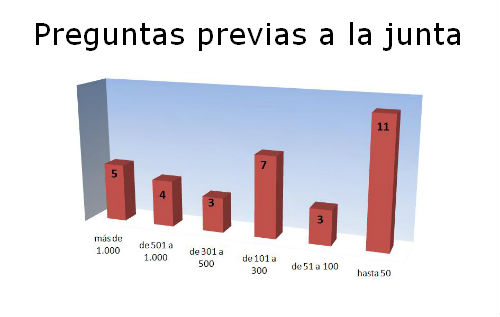 En el caso de las preguntas que los accionistas realizan antes de la junta, BBVA, Criteria Caixa, Iberdrola, Repsol y Telefonica recibieron más de 1.000 solicitudes. Banco Santader, Iberdrola Renovable, Intra y REE recibieron, en cambio, entre 501 y 1.000.