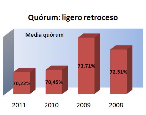 En cuanto al Quorum, la asistencia a las juntas, descendió un 0,23% este último año, situándose en el 70,22%. Se nota que los dos años de crisis han repercutido en el Quórum reduciéndolo. Para recuperarlo será necesario realizar un gran esfuerzo.