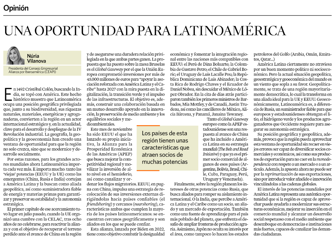 Este mes de noviembre ha sido EEUU el que ha lanzado su propia iniciativa, la Alianza para la Prosperidad Económica de las Américas (APEP), que busca mejorar la competitividad regional y movilizar la inversión de alto nivel en el hemisferio, así como canalizar y ordenar los flujos migratorios. EEUU, en pugna con China, impulsa una estrategia de recolocación de sus inversiones externas dirigiéndolas hacia países confiables (el friendshoring) y cercanos (nearshoring), características ambas que cumplen la mayoría de los países latinoamericanos: se encuentran cercanos geográficamente y son aliados en los que se puede confiar.